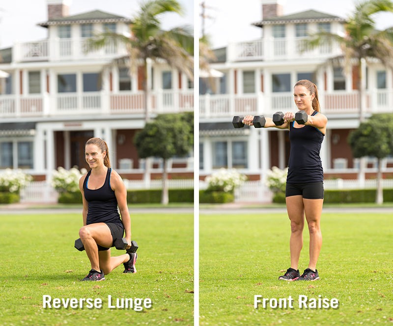 - Obrácený výpad + přední zvednutí : 10 – 12 opakování na každou nohu