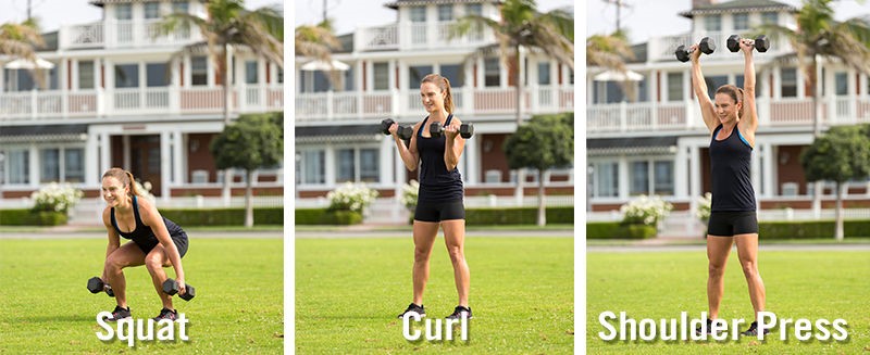 - Dřep + Curl + Tlak na ramena : 10 – 12 opakování