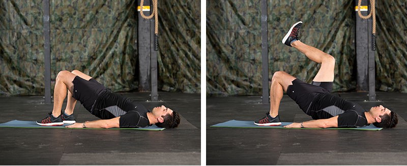 Zaměření: Lumbo-pánevní stabilita Jak provést: Lehněte si na záda a položte ruce v bok. Zvedněte boky a držte hýžďový most. Zvedněte pravou nohu z podlahy do 90 stupňů v kyčli a koleni. Vraťte nohu na podlahu a poté zvedněte levou nohu o 90 stupňů; vrátit se do středu. Udržujte boky zvednuté a udržujte neutrální pánev, když střídáte zdvihy nohou po 20 opakováních. Alternativní verze : Držte statický hýžďový most a mějte obě nohy na podlaze po dobu 30 nebo více sekund.