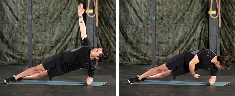 Zaměření: Síla jádra a stabilita ramen Jak cvičit : Umístěte tělo do boční desky s předloktím a obě nohy natáhněte. Zvedněte horní část paže přes hrudník a poté otáčejte hrudním košem, abyste natáhli ruku pod žebra. Opakujte tento pohyb 10 až 12 opakování a poté proveďte na druhou stranu. Alternativní verze : Cvičení provádějte na upraveném bočním prkně s bércem na podlaze.