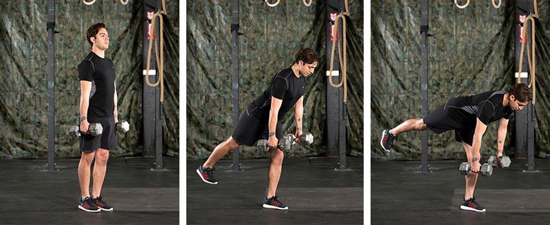 Zaměření: Síla zadního řetězu Jak cvičit : Držte sadu činek a postavte se vysoko s nohama na vzdálenost boků. Zvedněte pravou nohu z podlahy a otočte pánev tak, aby klouzala po horní části levé nohy. Hlava a chodidlo by se měly vzájemně vyvažovat. Nejnižší bod závěsu by měl být, když je tělo rovnoběžné s podlahou. Udržujte pánev pokud možno neutrální. Dokončete 12 opakování na každou nohu. Alternativní verze: Provádějte cvik bez činek nebo dokončete mrtvý tah s oběma nohama na podlaze .