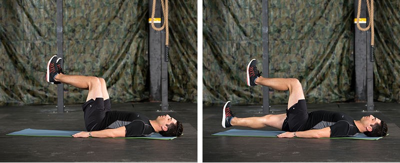 Zaměření: Stabilita jádra Jak provádět: Lehněte si na záda a položte paže podél těla. Zapojte břišní svaly a přitáhněte pupek směrem k páteři. Zvedněte kolena do 90 stupňů. Při kontrole spusťte pravou nohu, abyste se patou dotkli podlahy, než ji vrátíte zpět do úhlu 90 stupňů. Proveďte stejný pohyb levou nohou a pokračujte ve střídavém poklepávání pravou a poté levou patou na podlahu. Proveďte 10 opakování s každou nohou. Dokončení každého opakování by mělo trvat asi čtyři sekundy, dvě sekundy snížení nohy a dvě sekundy zvednutí nohy zpět do 90 stupňů. Alternativní verze: Udržujte nohy na podlaze a posuňte patu na podložku, nohy střídejte.