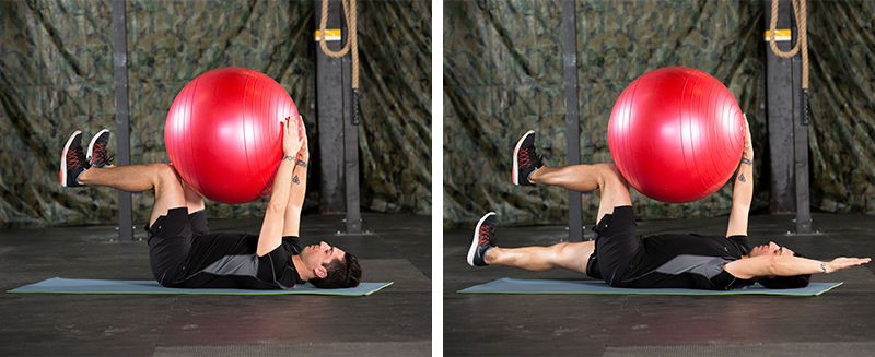 Zaměření: Stabilita jádra Jak cvičit : Lehněte si na záda a zvedněte kolena do 90 stupňů. Umístěte stabilizační míč na kolena a zatlačte ruce a nohy do stabilizačního míče. Zapojte základní svaly a přitáhněte pupek směrem k páteři. Natáhněte levou paži a pravou nohu a pokračujte v držení míče levou nohou a pravou rukou. Čím rovnější končetiny, tím náročnější je cvičení . Ujistěte se, že kolena zůstávají v úhlu 90 stupňů, když se vracíte zpět do středu (lýtka se dotýkají hamstringů, což usnadňuje cvičení). Dokončete 10 opakování na každé straně a střídejte, které paže a nohy jsou při každém opakování nataženy . Alternativní verze : Cvičení provádějte bez stabilizačního míče a při spouštění udržujte kolena v úhlu 90 stupňů. Je to podobné jako výše popsané cvičení Supine Heel T aps , ale s přidáním paží.