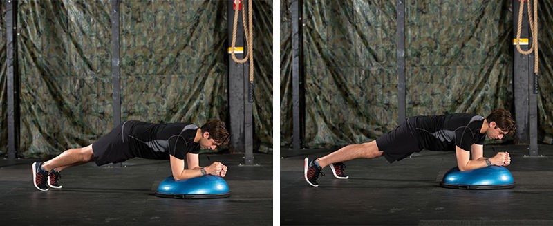 Zaměření: Stabilita jádra a síla kyčlí Jak cvičit : Umístěte tělo na prkno předloktí s pažemi položenými na kupolové straně balančního trenažéru BOSU . Začněte střídavě poklepávat bočními prsty, kdy pravá noha tlačí od těla, dotýká se podlahy a pak se vrací do středu. Opakujte s levou nohou. Dokončete sadu 10 opakování na každé noze . Alternativní verze : Proveďte statické prkno předloktí s chodidly na vzdálenost boků a předloktími na podlaze .